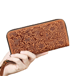Cartera de cuero genuino en relieve de Caballo Loco Vintage para hombre, cartera de mano larga con doble cremallera, forro de algodón, monedero de teléfono a la moda