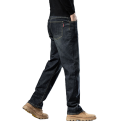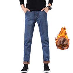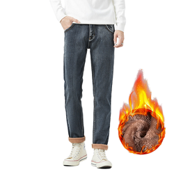 Pantalones vaqueros ajustados elásticos de otoño informales holgados de pierna recta a la moda para hombre, Vaqueros transpirables con forro polar de invierno, medio sólido medio